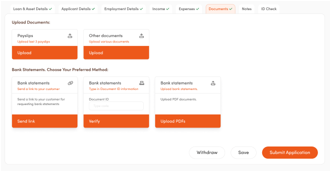 - On the Upload Documents screen, select the type of document you wish to upload — such as Payslips or Other Documents — and click the Upload button.
