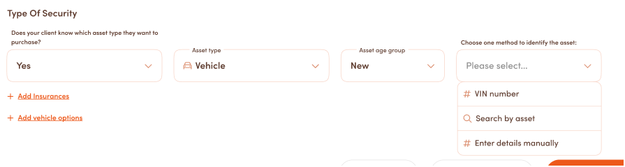 If you choose Search Manually, use the dropdown options to select the asset the customer is purchasing.